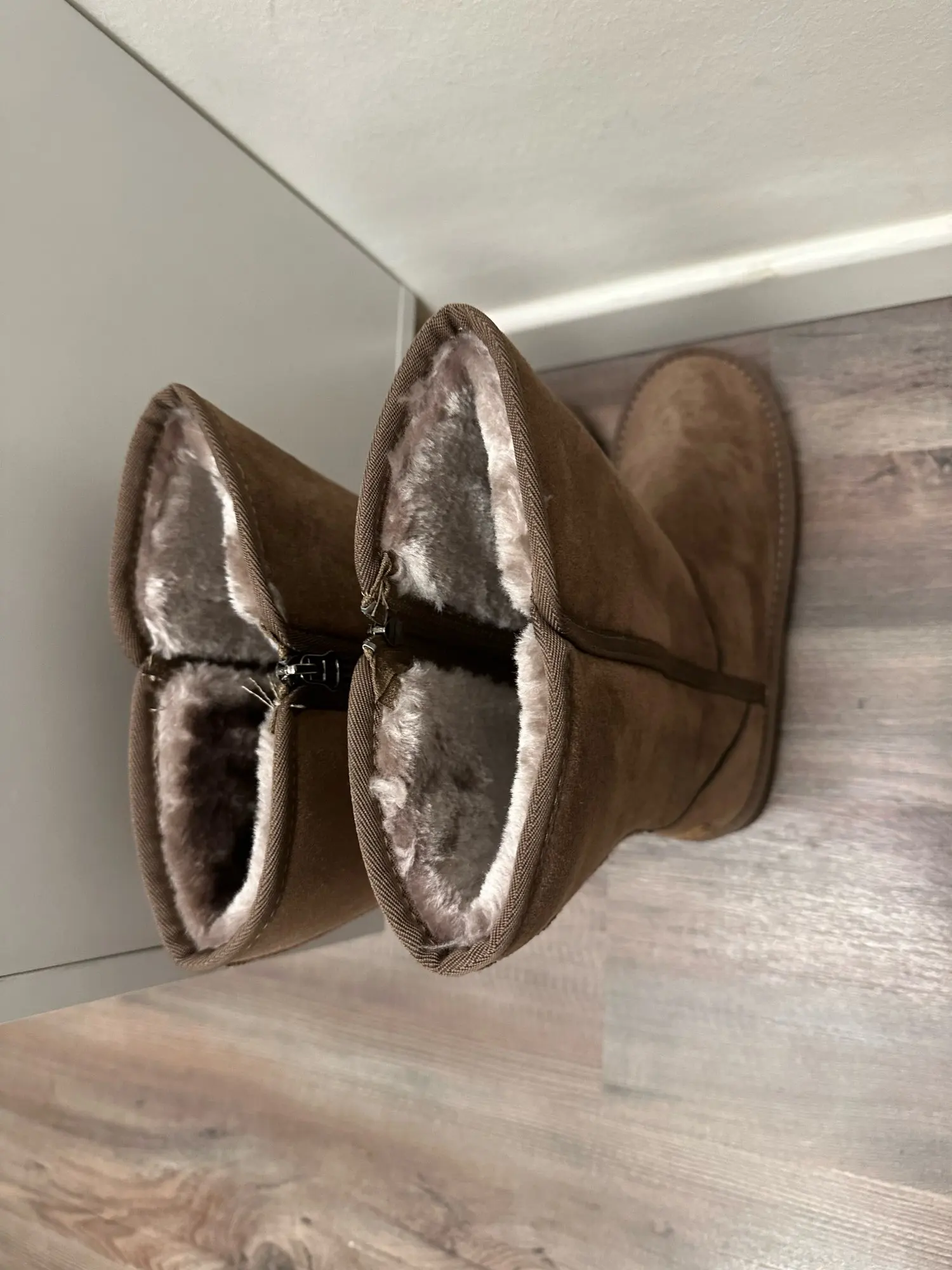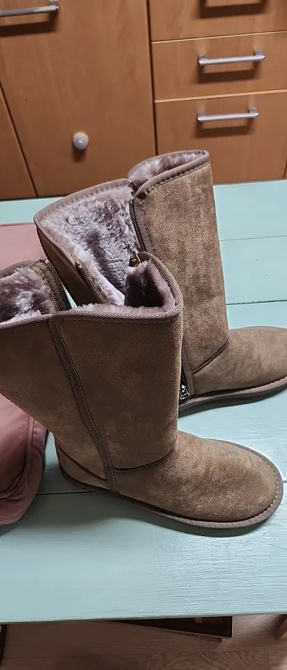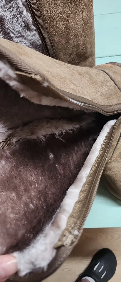 Copre il polpaccio, quindi penso che sarà caldo. Penso che staro' bene. Il colore è marrone chiaro. La pelliccia è spessa e contiene molto. Se nevica, non credo sia impermeabile.